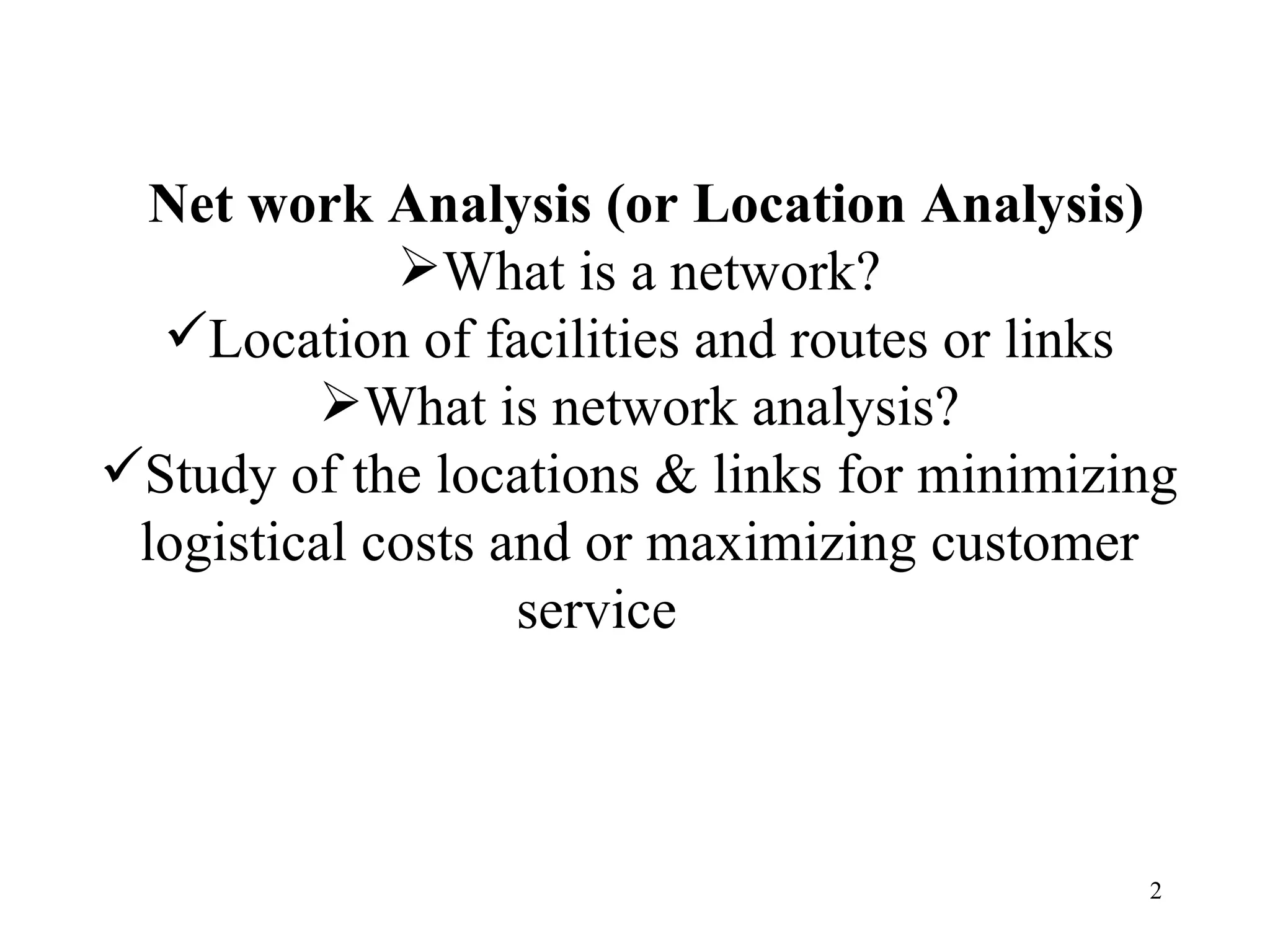 Logistical coordination involves smooth flow of information, inventory, and realization through coordination of logistical plans that consider strategic customer service objectives and constraints. Network analysis studies locations and links between facilities to minimize costs and maximize customer service. Key decisions in network design include the number and locations of facilities, activities performed, size, and factors like storage type and order picking versus replenishment activities. The number, location, and operator of facilities influence costs and customer service by impacting transshipment, response times, and communication between locations. Models for facility location include gravity, analytical, and ton-mile center models.