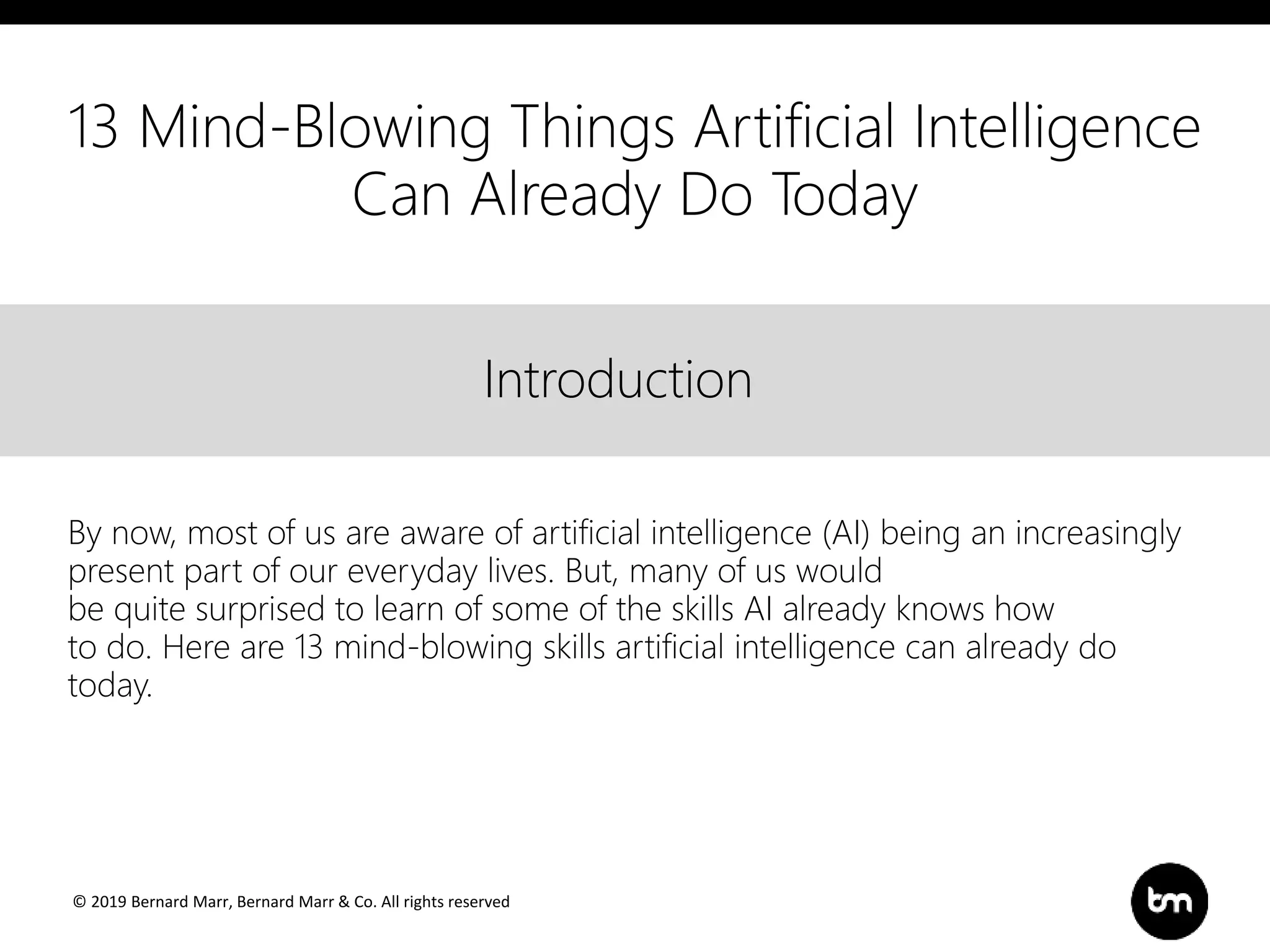 The document outlines 13 remarkable capabilities of artificial intelligence (AI), highlighting its presence in various fields such as text summarization, creative writing, machine vision, sound analysis, and more. It emphasizes how AI can perform tasks ranging from detecting gunshots and scheduling appointments to analyzing emotions and even creating art. Additionally, it raises intriguing questions about the future potential of AI if these skills were to be integrated into a 'super' AI.