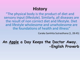 This document discusses nutraceuticals and their potential uses. It begins by classifying nutraceuticals into nutrients, herbals/phytochemicals, and dietary supplements. It then discusses some specific nutraceuticals like artichoke extract, green tea catechins, and apple extracts, outlining their bioactive components and potential health benefits such as cholesterol lowering, antioxidant effects, and neuroprotective properties. The document also discusses using nutraceuticals like apple varieties to help treat metabolic syndrome and compares this approach to using atorvastatin.