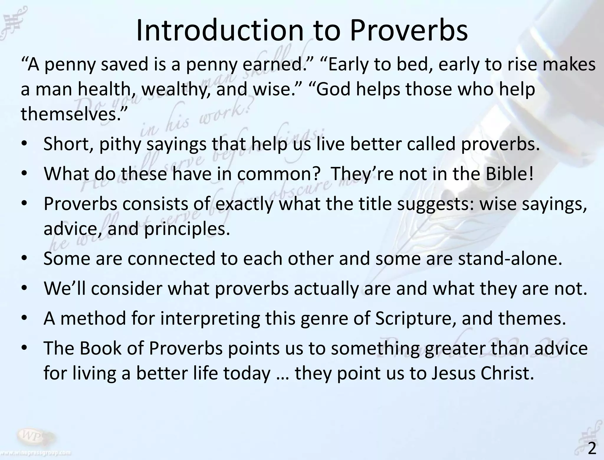 The document provides an overview of the Book of Proverbs, emphasizing its role as a collection of wise sayings primarily attributed to King Solomon aimed at teaching ethical living and wisdom. It outlines key themes such as the fear of the Lord, the importance of humility, and the practical application of wisdom in various life contexts, including family and friendships. Ultimately, it connects the wisdom found in Proverbs to Christian teachings, highlighting that true wisdom leads one closer to understanding God and living a life aligned with His principles.