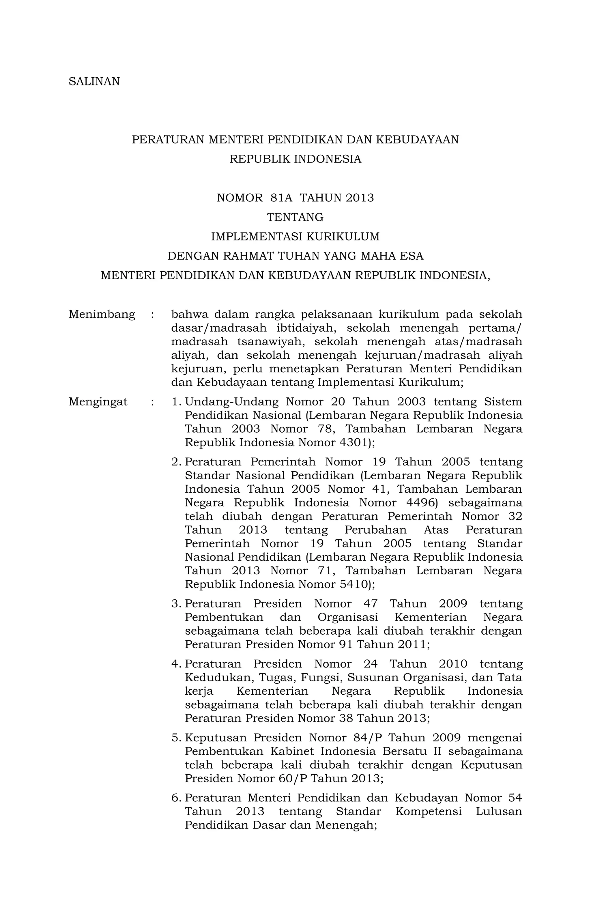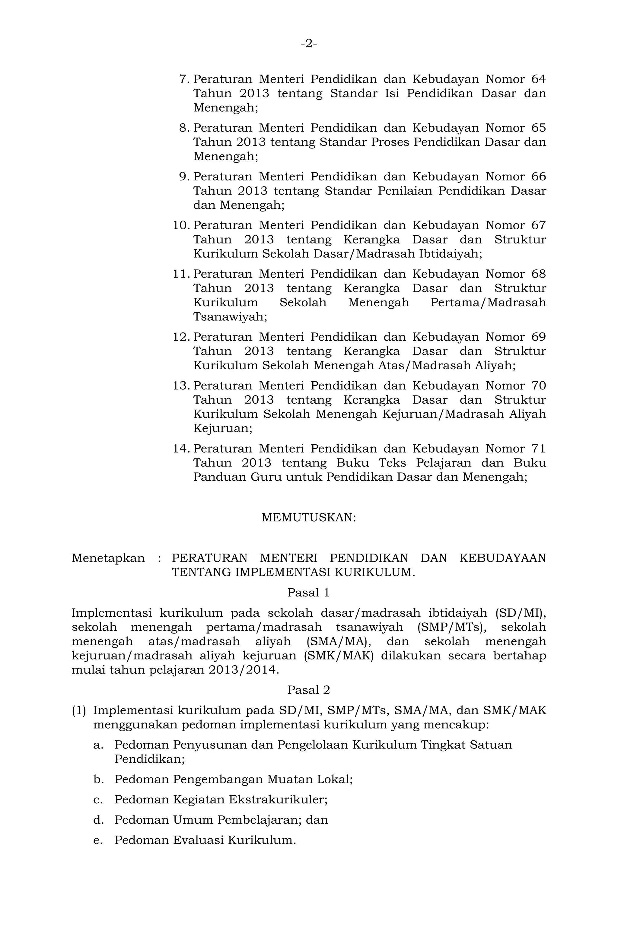 Peraturan Menteri ini mengatur tentang implementasi kurikulum baru pada sekolah dasar, menengah, dan kejuruan secara bertahap mulai tahun 2013/2014. Kurikulum di tingkat sekolah (KTSP) harus mengacu pada standar nasional, tetapi dapat menambahkan muatan lokal dan kekhasan sekolah berdasarkan kondisi daerah dan peserta didik. Pedoman ini memberikan panduan penyusunan dan pengelolaan KTSP.