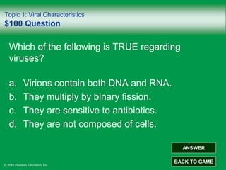 This document contains a quiz on viruses, viroids, and prions from a textbook chapter. It consists of multiple choice questions divided into topics including viral characteristics, cultivation, infections, relationships to cancer, and properties of prions and viroids. For each question, the multiple choices are listed and the correct answer identified when the user selects their choice. The quiz covers details about viral structure, life cycles, diseases caused, and molecular mechanisms of infection and pathogenesis.