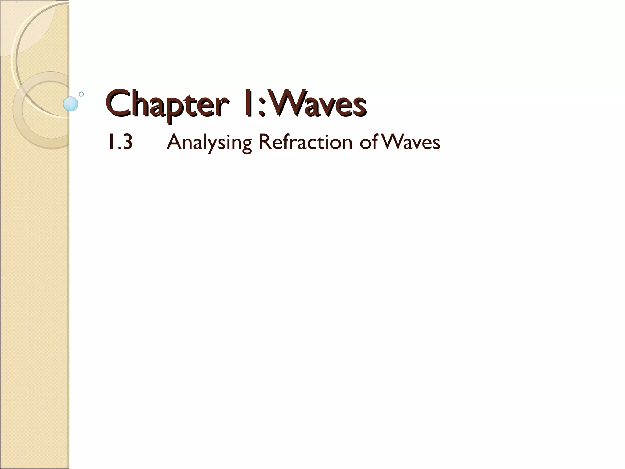 This document discusses the refraction of waves, including water waves, light waves, and sound waves. It provides details on how refraction occurs when a wave's speed changes as it passes from one medium to another with a different speed. Water waves refract toward the normal when passing to shallower water and away from the normal when passing to deeper water. Light waves refract toward the normal when passing to a denser medium. Sound waves refract at night due to changes in air temperature near the ground.
