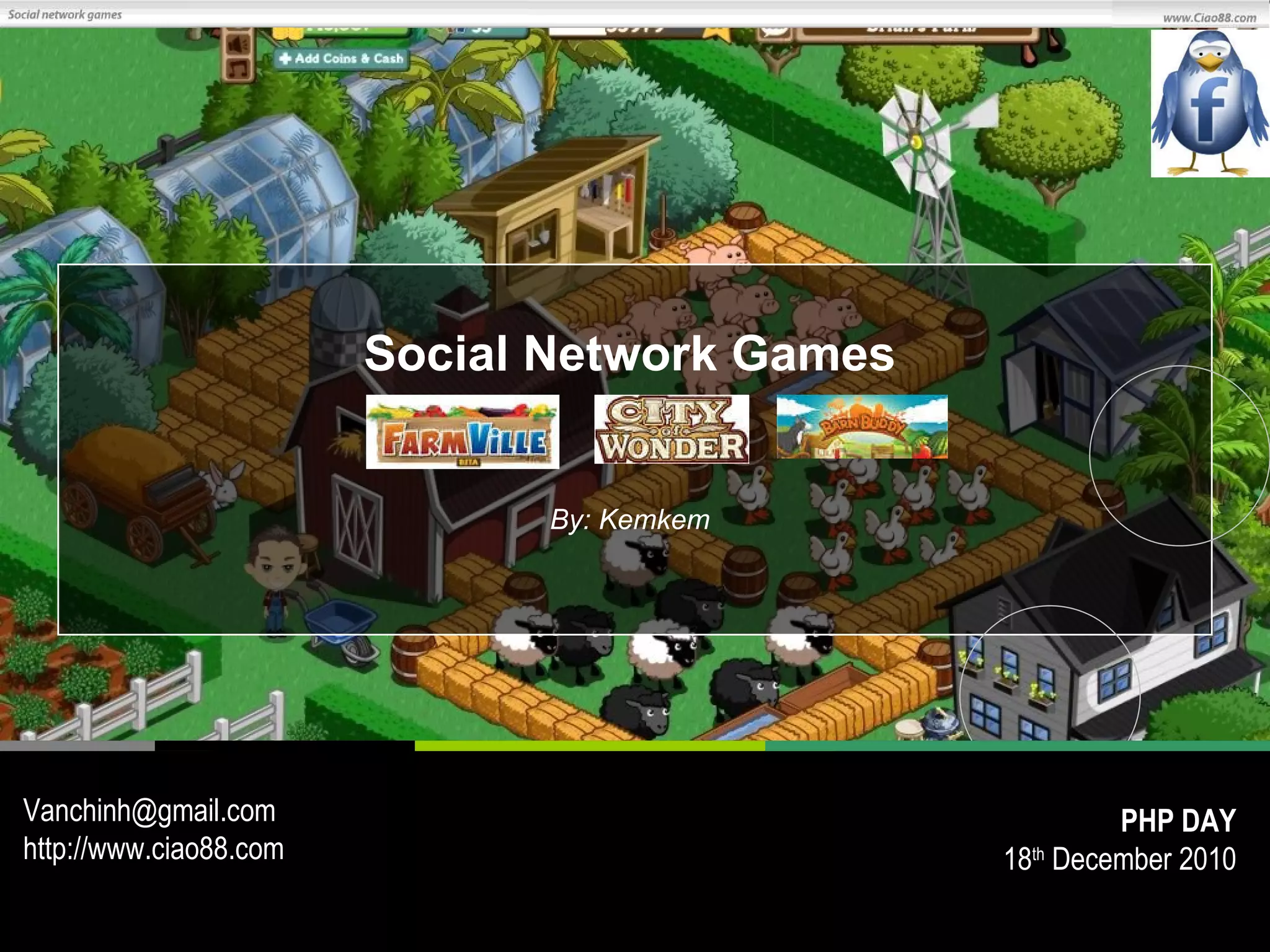 Tài liệu cung cấp cái nhìn tổng quan về game mạng xã hội, nhấn mạnh sự phát triển trong công nghệ và nhân lực cần thiết để tạo ra những trò chơi này. Nó chỉ ra rằng game mạng xã hội có tính xã hội cao và không yêu cầu công nghệ phức tạp như game truyền thống, với lợi nhuận chủ yếu đến từ quảng cáo. Cuối cùng, tài liệu cũng đề cập đến việc khởi động một dự án game mạng xã hội trên nền tảng như Facebook, cùng với các công nghệ và giao thức cần thiết.