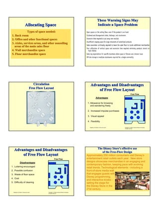 The document discusses store layout and design. It describes elements that compose the store environment like store image and objectives to attract customers. It also discusses store planning including allocating space, circulation designs like free flow and grid layouts, and floorplans for different stores. Fixture and merchandise presentation planning is also covered, discussing methods and psychological factors to consider.