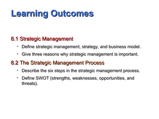 This document discusses strategic management and strategic planning processes. It begins by defining key terms like strategic management, strategy, and business models. It then outlines the six steps in the strategic management process: 1) identifying the organization's mission and goals, 2) external analysis, 3) internal analysis, 4) formulating strategies, 5) implementing strategies, and 6) evaluating results. It also describes three major corporate strategies - growth, stability, and renewal - and explains types of growth strategies like concentration, vertical/horizontal integration, and diversification. The BCG matrix and Porter's five forces model are introduced as tools for managing corporate strategies and assessing competitive advantage.