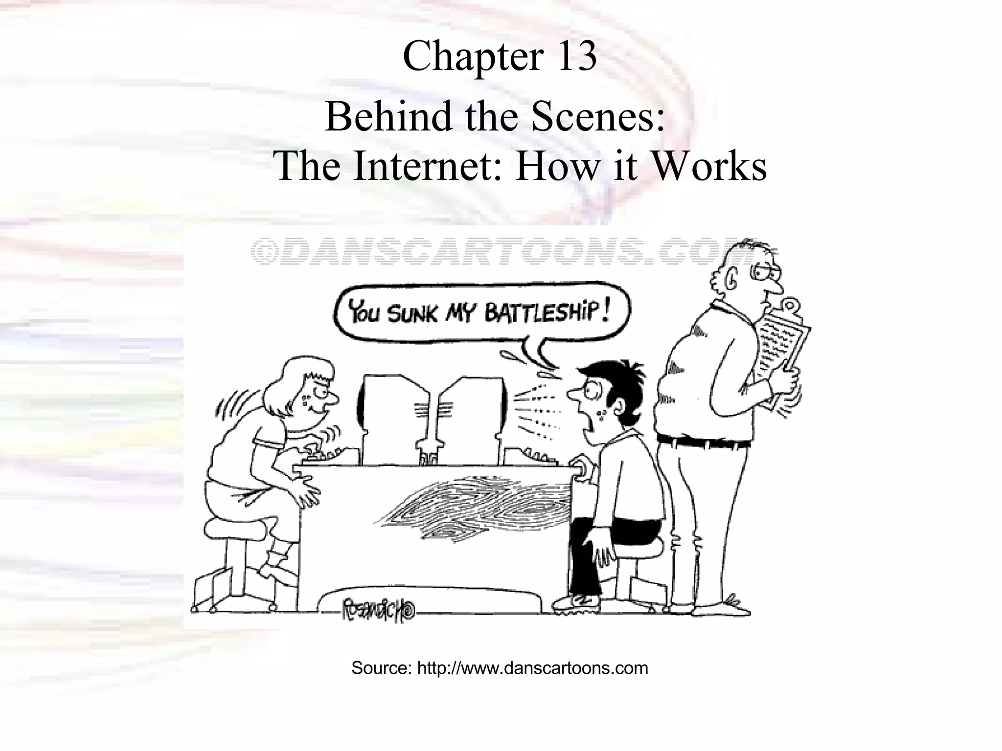 The document summarizes how the internet works through a network hierarchy and protocols. It discusses how the internet is managed by nonprofit organizations and government agencies and paid for by taxpayers and businesses. It also outlines the layered network structure and protocols like TCP/IP that allow communication between connected devices and translation of domain names to IP addresses through DNS servers. Common internet applications and protocols for file transfer, web pages, email, and instant messaging are also summarized.
