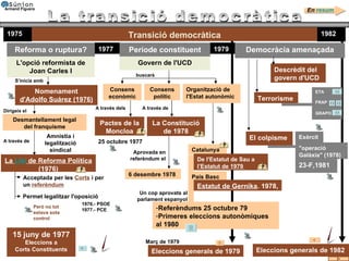 La transició democràtica1977 1979 Transició democràtica Reforma o ruptura? Període constituent Democràcia amenaçada 1975 1982 L'opció reformista de Joan Carles I 15 juny de 1977 Eleccions a Corts Constituents Nomenament d'Adolfo Suárez La Llei de Reforma Política (1976) Govern de l'UCD Consens econòmic Pactes de la Moncloa Consens polític La Constitució de 1978 Organització de l'Estat autonòmic Catalunya País Basc l' Estatut de Sau (1978) Estatut de Gernika . 1978, Terrorisme Descrèdit del govern d'UCD El colpisme Eleccions generals de 1982 Eleccions generals de 1979