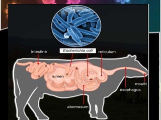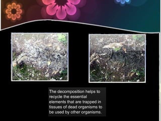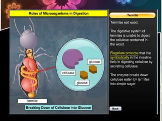 Microorganisms play an important role in decaying dead organisms and enriching the soil. They break down complex compounds into simpler ones that plants can use. Herbivores rely on bacteria in their stomach to digest cellulose from plants. Certain bacteria also live in human intestines and help with digestion while destroying harmful microbes. Some microbes like Penicillium molds produce important antibiotics that can treat diseases. Genetically engineered bacteria can produce vaccines and insulin. Microbes are crucial in agriculture by releasing nitrogen that plants need and in various industries through fermentation processes.