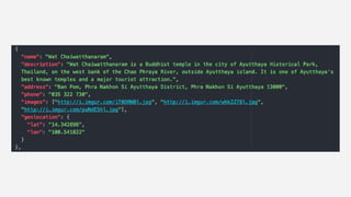 This document discusses web service integration using REST APIs, JSON, and libraries like Retrofit, Picasso, and Gson. It provides examples of making GET, POST, PUT, and DELETE requests to REST APIs and parsing the JSON response. It also demonstrates how to make API calls using Retrofit, display images with Picasso, and includes code snippets for setting up the dependencies in build.gradle. Finally, it lists some online tools for working with REST APIs and JSON, and provides links to JSON data and REST endpoints for code labs.