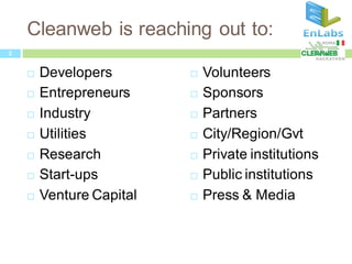 This document outlines next steps for Cleanweb Italy following its launch meeting at Università Luiss in Rome on September 19th, 2012. It encourages people from various sectors to get involved through the Cleanweb website, mailing list, social media, and biweekly meetups in Enlabs starting in October. A major event is the Roma Cleanweb Hackathon from November 30th to December 2nd, where developers will build projects around sustainability and their work will be judged. The document thanks current sponsors and partners and notes there are open opportunities for others to get involved in sponsoring or partnering with Cleanweb.