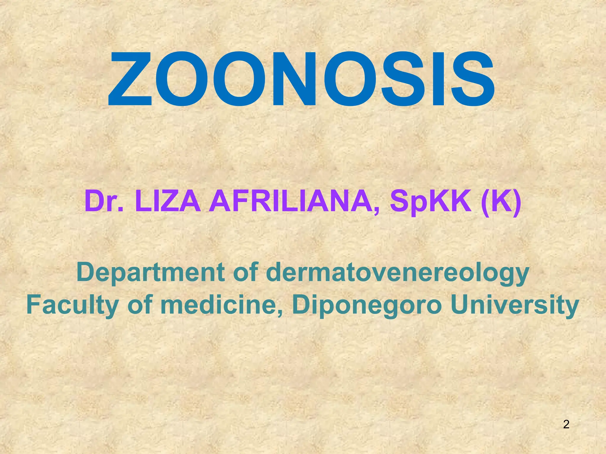 Dokumen membahas berbagai zoonosis yang disebabkan oleh parasit dan menekankan pentingnya diagnosis awal, pengobatan cepat, dan pendidikan kesehatan masyarakat untuk pencegahan. Jenis-jenis parasit yang dibahas termasuk protozoa, helminth, dan arthropoda, serta manifestasi klinis masing-masing infeksi. Pengobatan yang direkomendasikan mencakup metronidazole, mebendazole, dan lainnya tergantung pada infeksi spesifik yang terjadi.