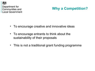 The document outlines a two-stage community-based English language competition process. Stage One will accept outline proposals, provide feedback, and award development grants to help smaller organizations strengthen proposals. Stage Two will require full business cases for projects addressing integration and English teaching. Up to four organizations will be awarded grant funding over 18 months, and successful projects will be monitored and evaluated based on learner data and impact.
