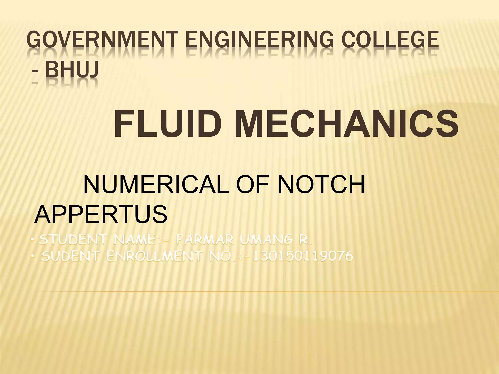 This document provides 5 examples of calculating discharge over notches of different shapes. Example 1 calculates discharge over a rectangular notch. Example 2 calculates the length of a rectangular notch given the discharge. Example 3 calculates discharge over a triangular notch. Example 4 calculates discharge over a trapezoidal notch. Example 5 calculates the depth of water required over a triangular notch to produce the same discharge as a rectangular notch. Formulas and step-by-step workings are shown for each example calculation.