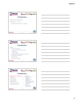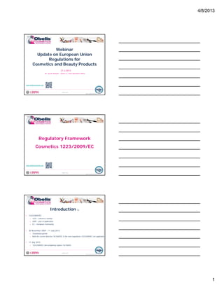 This document provides an overview and summary of the key changes in European Union regulations for cosmetics and beauty products under Regulation 1223/2009/EC, which will replace Directive 76/768/EEC on July 11, 2013. It outlines the six main steps for cosmetic product compliance and market entry in the EU, including designating a responsible person, product classification, building a product information file, notification, market entry, and remaining compliant. It also describes in detail the requirements for the product information file, safety assessment, and designation of a responsible person located within the EU.