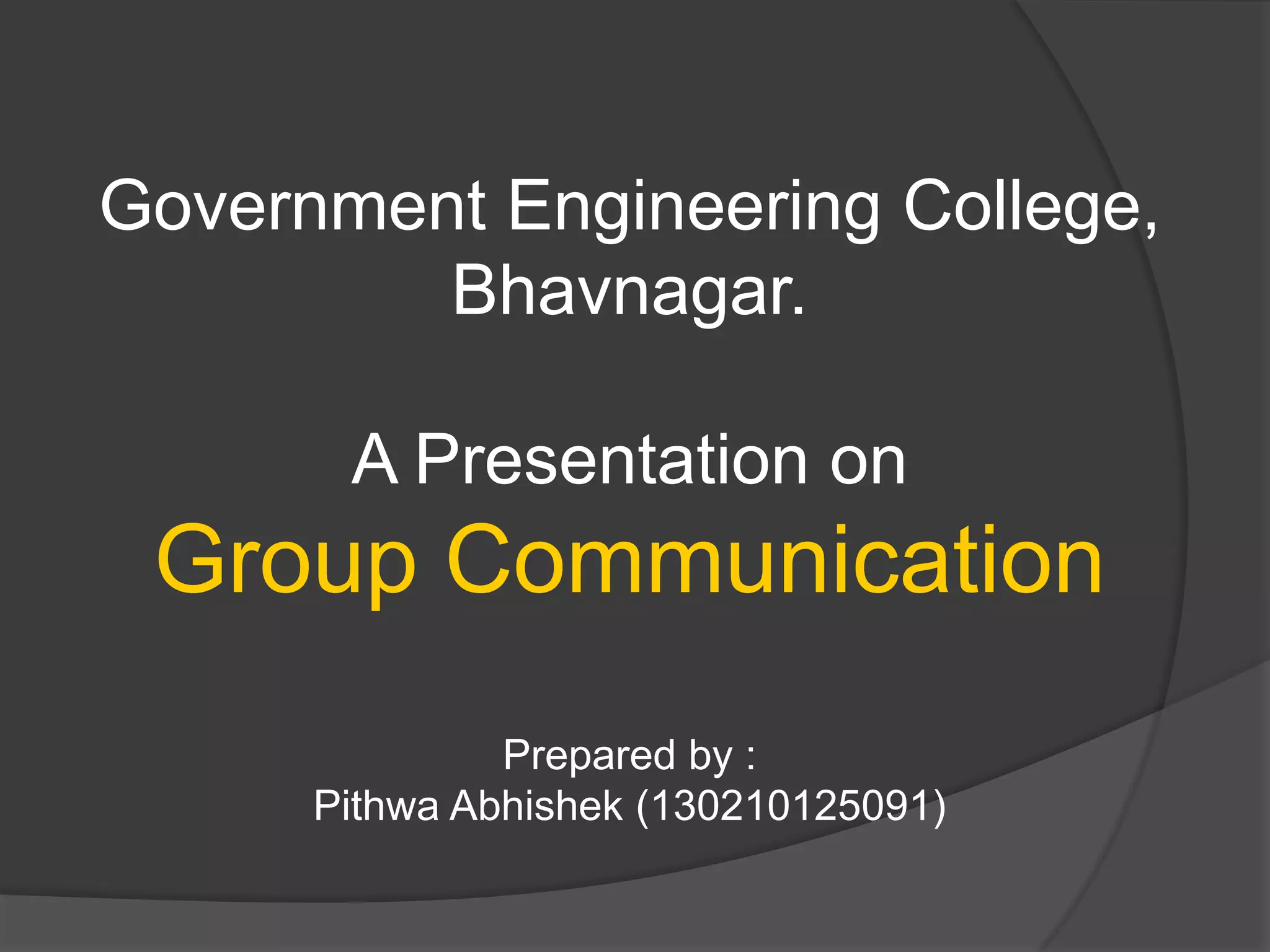 Group communication refers to communication between 3 or more individuals gathered to solve a problem or discuss a topic. It is an important part of teamwork and organizational efficiency. There are two main categories of group discussions: organizational discussions and discussions as part of a selection process. The main purposes of group communication are to share information and ideas, collect feedback, arrive at decisions, solve problems, discuss group issues, and get faster solutions. Group discussions are also used for evaluation, assessing factors like knowledge, communication skills, leadership skills, and approach to topics. Some tips for successful group discussions include being prepared on current issues, listening carefully, organizing ideas before speaking, encouraging others to share views, and aiming for a solution within the allotted time.