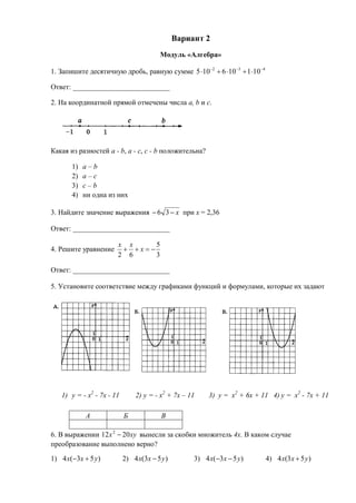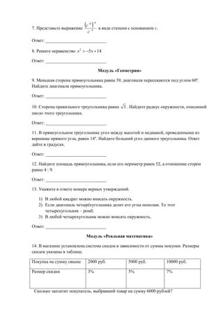 Документ содержит множество задач по алгебре, геометрии и реальной математике, с вопросами на вычисления, уравнения и доказательства. Задачи требуют нахождения значений, установления соответствий и решения неравенств, а также включают практические применения, такие как вопросы о скидках и вероятностях. Каждая задача имеет формат с пробелами для ответов, что свидетельствует о предназначении документа для тестирования или учебных целей.