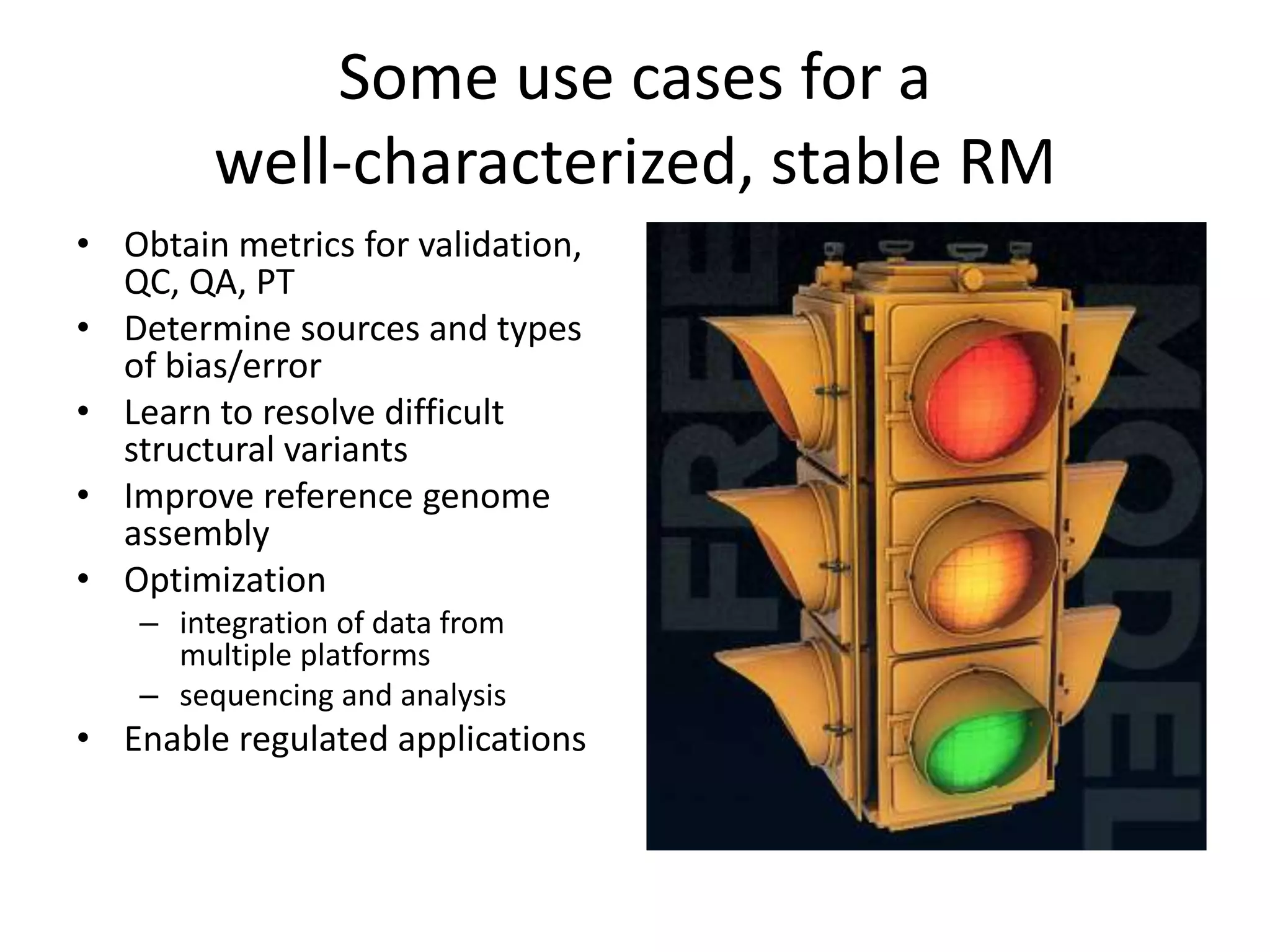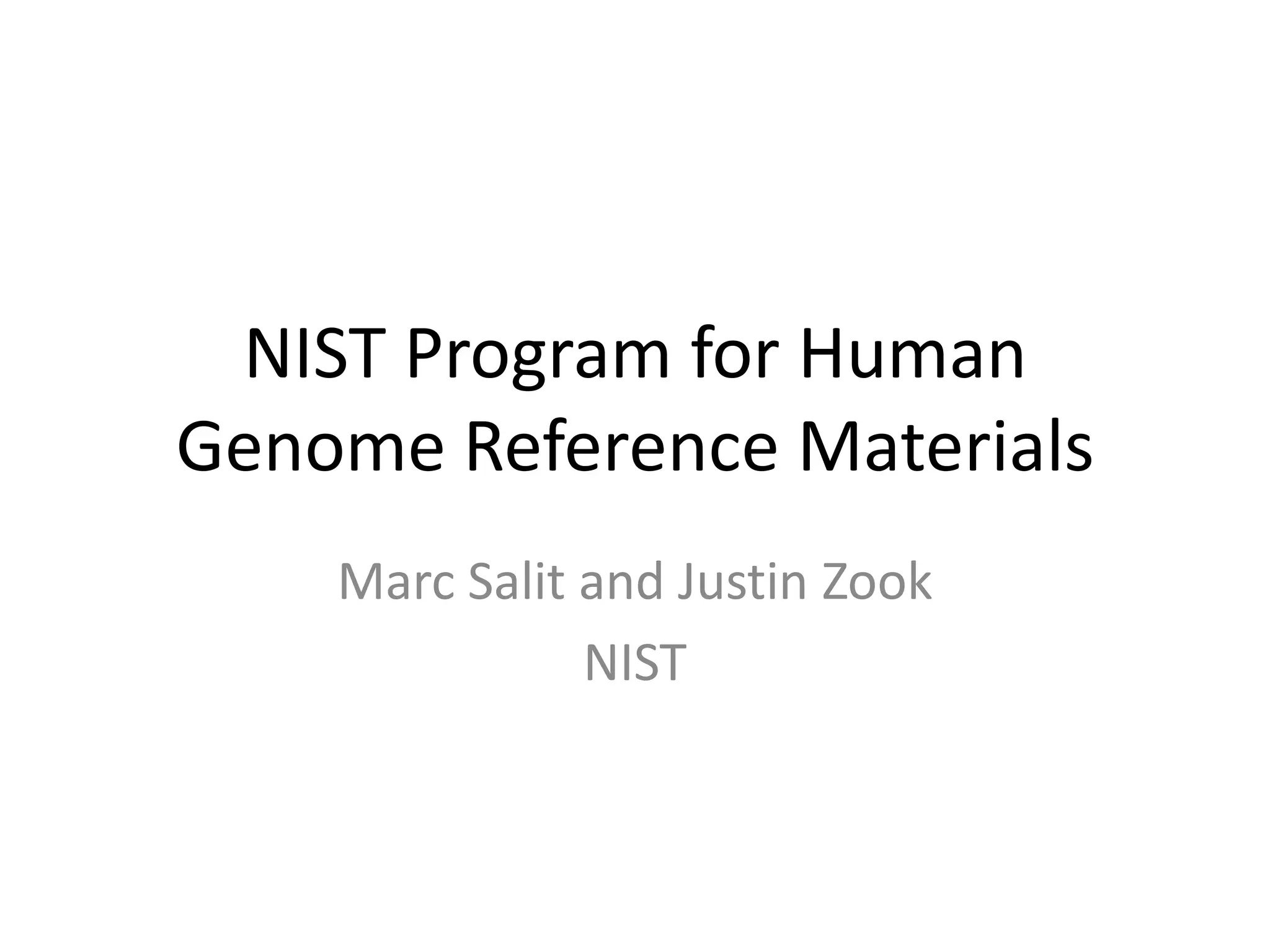 This document discusses NIST's program for developing human genome reference materials. It describes some use cases for well-characterized reference materials, such as validation, quality control, and improving genome assembly. The document outlines NIST's process for characterizing the performance of genome sequencing and variant calling using reference samples like NA12878. It discusses challenges with data integration and assessing sequencing performance.