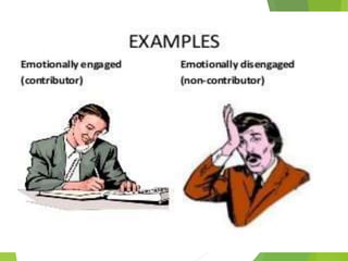 The document discusses how people can engage deeply in their work. Contributors care deeply about their work and commit themselves to the success of their projects. They seek to create high quality products and care about the quality and usefulness of what they produce. Emotional engagement is described as being emotionally connected to one's work and accepting challenges without hesitation. In contrast, emotional disengagement means being unconcerned about assigned work and thinking tasks are boring. Sharing a vision with a group can inspire wholehearted engagement and improve performance.