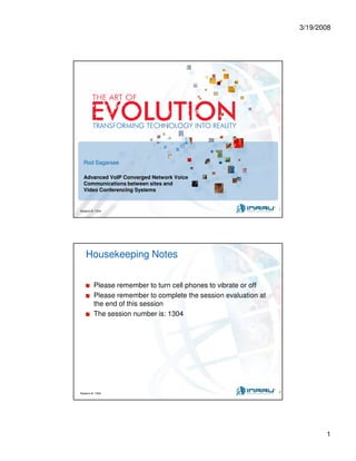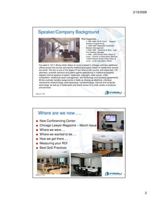 Rod Sagarsee presented on Brinks Hofer Gilson & Lione's implementation of an advanced VoIP and video conferencing system. They upgraded from an ISDN-only system with limited conferencing to a full VoIP network with a new conferencing center allowing high-quality audio and video calls between all offices. Key steps included researching products, measuring ROI, designing topology to ensure quality of service, and implementing solutions like Avaya Meet-Me conferencing and mobile advanced audio/video units. The new system provides significant cost savings and productivity gains compared to their previous capabilities.