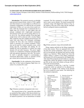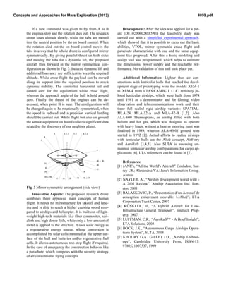 The document proposes an ultralight solar-powered hybrid research drone for exploring Mars. The drone would use lighter-than-air gases like hydrogen or helium inside its lenticular hull to achieve buoyancy and reduce structural mass. It can take off and land vertically and transition to efficient horizontal cruise flight using its wings, engines, and moveable control surfaces. The drone is designed to operate autonomously using solar energy from photovoltaic cells on its hull to recharge batteries and potential fuel cells. It combines aspects of airplanes, airships, and helicopters into a single vehicle capable of performing scientific observations across the Martian surface with minimal infrastructure requirements.