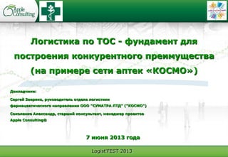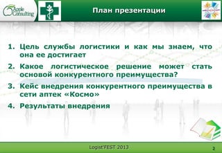 Доклад на Logist'fest 2013 обсуждает важность логистики в создании конкурентного преимущества, особенно на примере сети аптек 'Космо'. Приводятся конкретные решения и изменения в логистической цепи, которые способствовали сокращению запасов, снижению out-of-stock, и увеличению валовой прибыли. Результаты внедрения новых принципов управления запасами показывают рост EBITDA и оптимизацию операционных расходов.