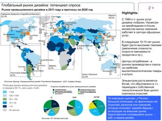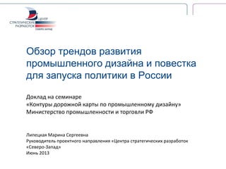 Доклад обсуждает текущие тренды и вызовы в области промышленного дизайна в России, отмечая высокий потенциал роста на международном рынке и необходимость преодоления 'дизайн-барьера'. Указывается на отсутствие сильных школ дизайна и инновационных центров в стране, что препятствует интеграции в глобальные цепочки. Рассматриваются возможные меры поддержки отстающих компаний, включая создание дизайн-школ, развитие кластеров и внедрение государственных программ.