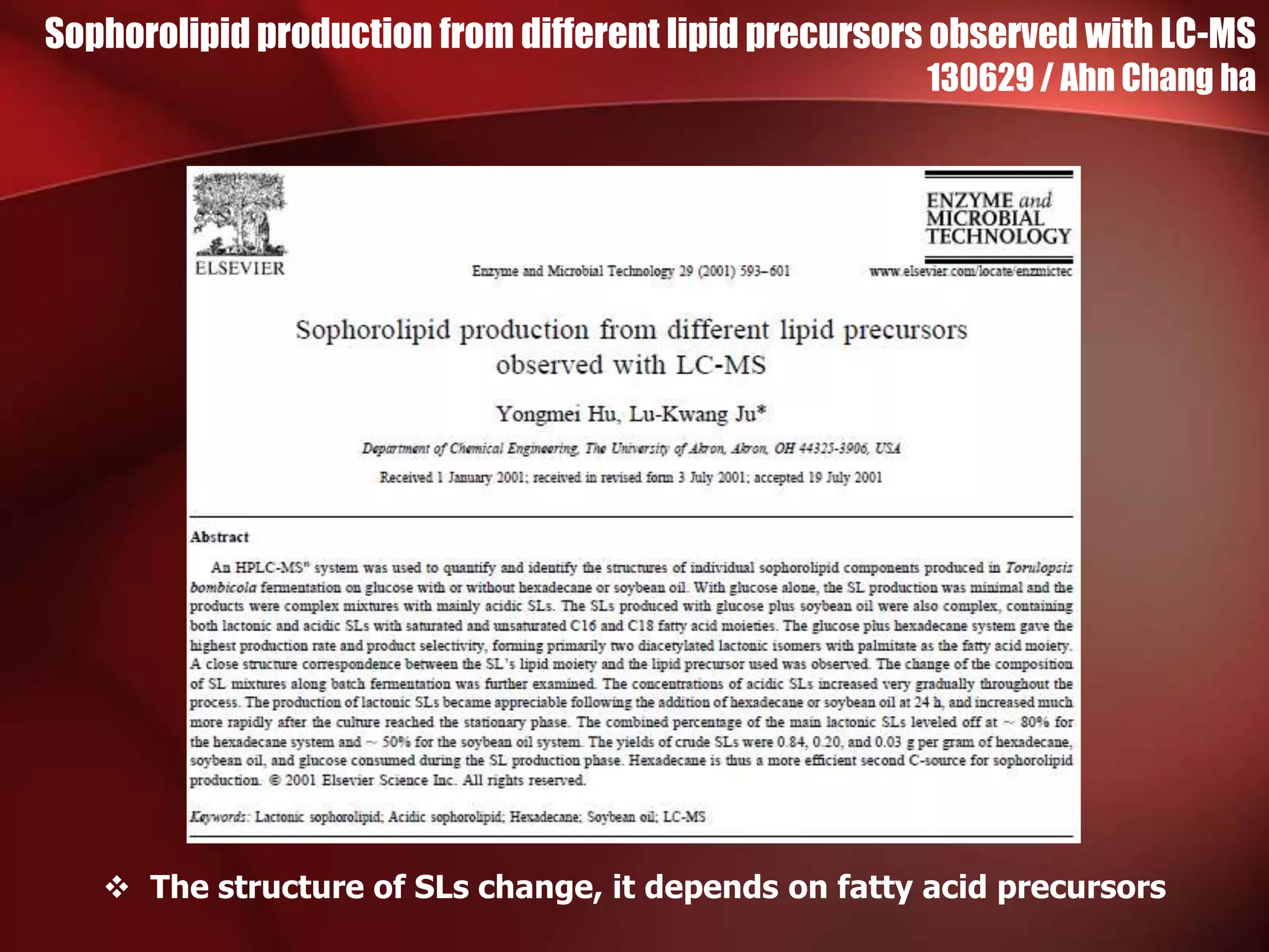 The study investigated the production of sophorolipids (SLs) by Torulopsis bombicola using different lipid precursors such as glucose, hexadecane, and soybean oil. Liquid chromatography-mass spectrometry analysis showed that hexadecane as a precursor produced a cleaner mixture of predominantly diacetylated lactonic SL isomers with palmitate. Soybean oil as a precursor resulted in SLs corresponding to its fatty acid composition. Production of lactonic SLs increased significantly following addition of the lipid precursors and peaked in stationary phase, while acidic SLs increased gradually. Hexadecane provided the highest SL yield and purity compared to soybean oil and glucose precursors.