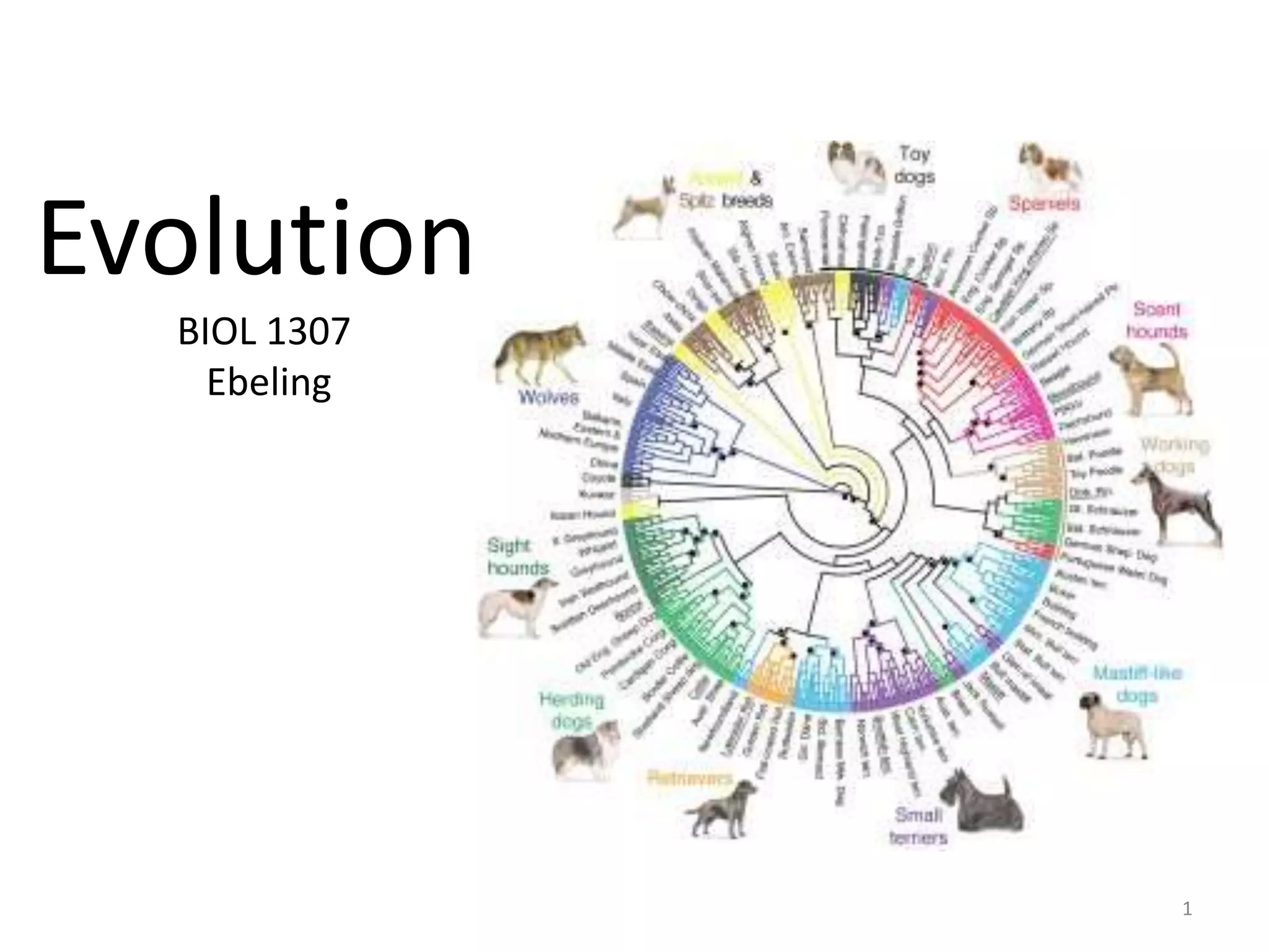 This document outlines learning objectives for a course on evolution. It covers key concepts like natural selection, genetic drift, gene flow, and mechanisms of evolution. Specifically, it defines terms, compares types of selection pressure, and explains how evolutionary factors like mutation and population size can influence allele frequencies over time. Hardy-Weinberg equilibrium and examples of natural selection in specific populations are also discussed.