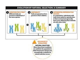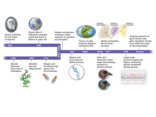 This document provides an introduction to the topic of evolution in biology. It defines evolution and key related terms like natural selection and reproductive success. It outlines several learning objectives around evolution and natural selection. The document then provides a historical overview of the major figures in the development of the theory of evolution, including Jean-Baptiste Lamarck, Charles Darwin, Alfred Russel Wallace, and Gregor Mendel. It also lists several forms of evidence that support the theory of evolution, such as the fossil record, carbon dating, biogeography, convergent evolution, homology, and molecular biology.
