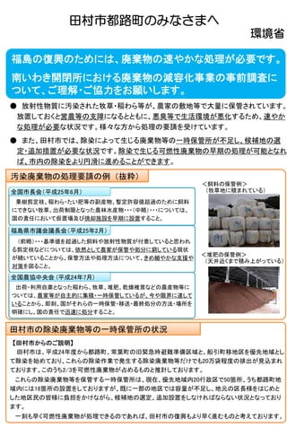 (平成24年7月) 出荷・利用自粛となった稲わら、牧草、堆肥、乾燥椎茸などの農産物等に ついては、農家等が自主的に集積・一時保管しているが、今や限界に達して いることから、即刻、国がそれらの一時保管・移送・最終処分の方法・場所を 明確にし、国の責任で迅速に処分すること。 田村市の除染廃棄物等の一時保管所の状況 【田村市からのご説明】 田村市は、平成24年度から都路町、常葉町の旧緊急時避難準備区域と、船引町移地区を優先地域とし て除染を始めており、これらの除染作業で発生する除染廃棄物等だけでも20万袋程度の排出が見込まれ ております。このうち2/3を可燃性廃棄物が占めるものと推計しております。 これらの除染廃棄物等を保管する一時保管所は、現在、優先地域内20行政区で50箇所、うち都路町地 域内には18箇所の設置をしておりますが、既に一部の地区では容量が不足し、地元の区長様をはじめと した地区民の皆様に負担をかけながら、候補地の選定、追加設置をしなければならない状況となっており ます。 一刻も早く可燃性廃棄物が処理できるのであれば、田村市の復興もより早く進むものと考えております。