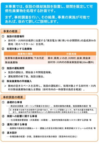 本事業では、仮設の焼却施設を設置し、期間を限定して可 燃性廃棄物を処理する計画です。 まず、事前調査を行い、その結果、事業の実施が可能で あれば、改めて詳しくご説明します。 事業の概要 ① 施設の設置場所 田村市・川内村の境界に位置する「東京電力(株)南いわき開閉所」の造成済みの 敷地(約6ヘクタール)を活用。 ② 処理対象とする廃棄物 廃棄物の種類 対象地域 牧草等の農林業系廃棄物、下水汚泥 除染廃棄物 ③ 県中、県南、いわき、川内村、会津、南会津 田村市・川内村の除染実施区域(20km圏外) 施設の運転期間 施設の運転は、開始後3年間程度稼働。 運転期間の終了後、施設は撤去。 ④ 除染廃棄物の早期搬入 敷地の空きスペースを活用し、施設の運転前に、処理対象とする田村市・川内 村の除染廃棄物の搬入を開始(田村市内の一時保管の負担を軽減)。 事前調査の概要 ① 基礎的な事項 ・・・・周辺状況調査(ボーリング調査※を含む)、処理対象物の精査、施設規模の検討 等 ※ 本事業では地下水を使用する計画であり、ボーリング調査によって、地下水の量を把握予定。 また、地域の井戸水や農業用水といった既存の水利用に支障を及ぼさないことを確認。 ② 周囲への影響に関する事項 ・・・・生活環境影響調査(大気環境・水環境)、放射性物質の拡散リスクに関する評価
