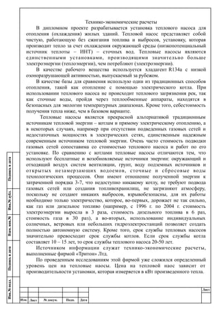 Документ описывает дипломный проект по разработке установки теплового насоса для отопления жилых зданий, который использует сточные воды как источник тепла и демонстрирует преимущества по сравнению с электрическим котлом, включая более низкие эксплуатационные расходы и меньшие выбросы углекислого газа. Тепловой насос имеет мощность 24 кВт и стоимость 88,800 руб., при этом срок окупаемости составляет 3 года, что делает его экономически выгодным вариантом отопления. В сравнении с электрическим котлом, тепловой насос потребляет значительно меньше энергии, что позволяет существенно сэкономить на затратам на электроэнергию.