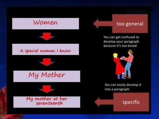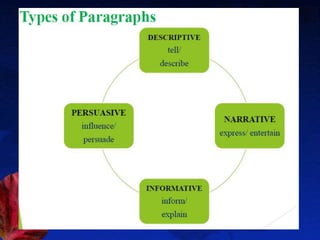 This document provides information about writing paragraphs. It defines what a paragraph is as a group of related sentences that develop a single main idea. The first sentence of a paragraph typically declares the main topic and the rest of the sentences support that idea. A paragraph is also part of a longer composition made up of several paragraphs. The document then discusses the components of a good paragraph including unity, support, coherence, and good language. It provides examples and tips for writing topic sentences, supporting sentences, and concluding sentences. Overall, the document serves as a guide for understanding the basic structure and elements of a well-written paragraph.