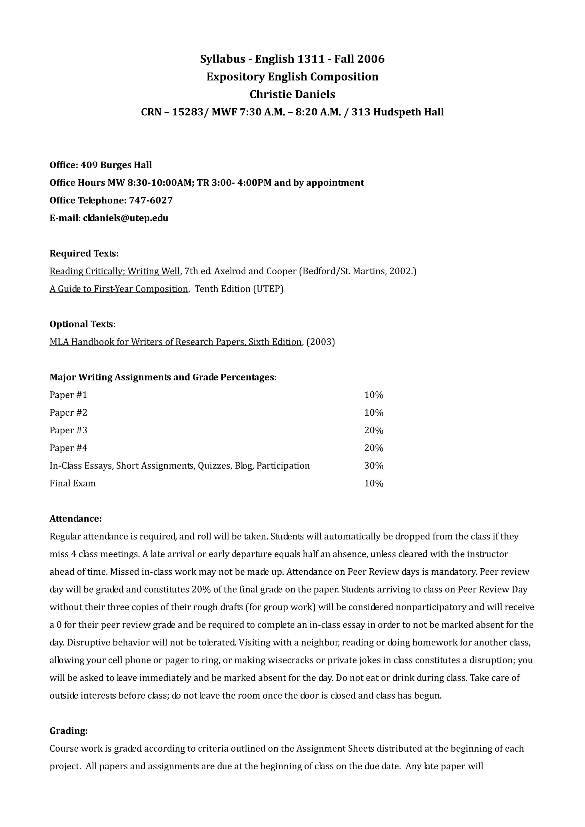 This document outlines the syllabus for an English 1311 Expository English Composition course taught in the fall of 2006. It provides information on the course objectives, assignments including 4 papers, exams, and a final. It describes the required textbooks and lists the major assignments and their percentages towards the overall grade. Attendance policies and expectations for writing quality are also outlined. A course schedule provides details on topics and due dates to be covered during each of the 15 weeks.