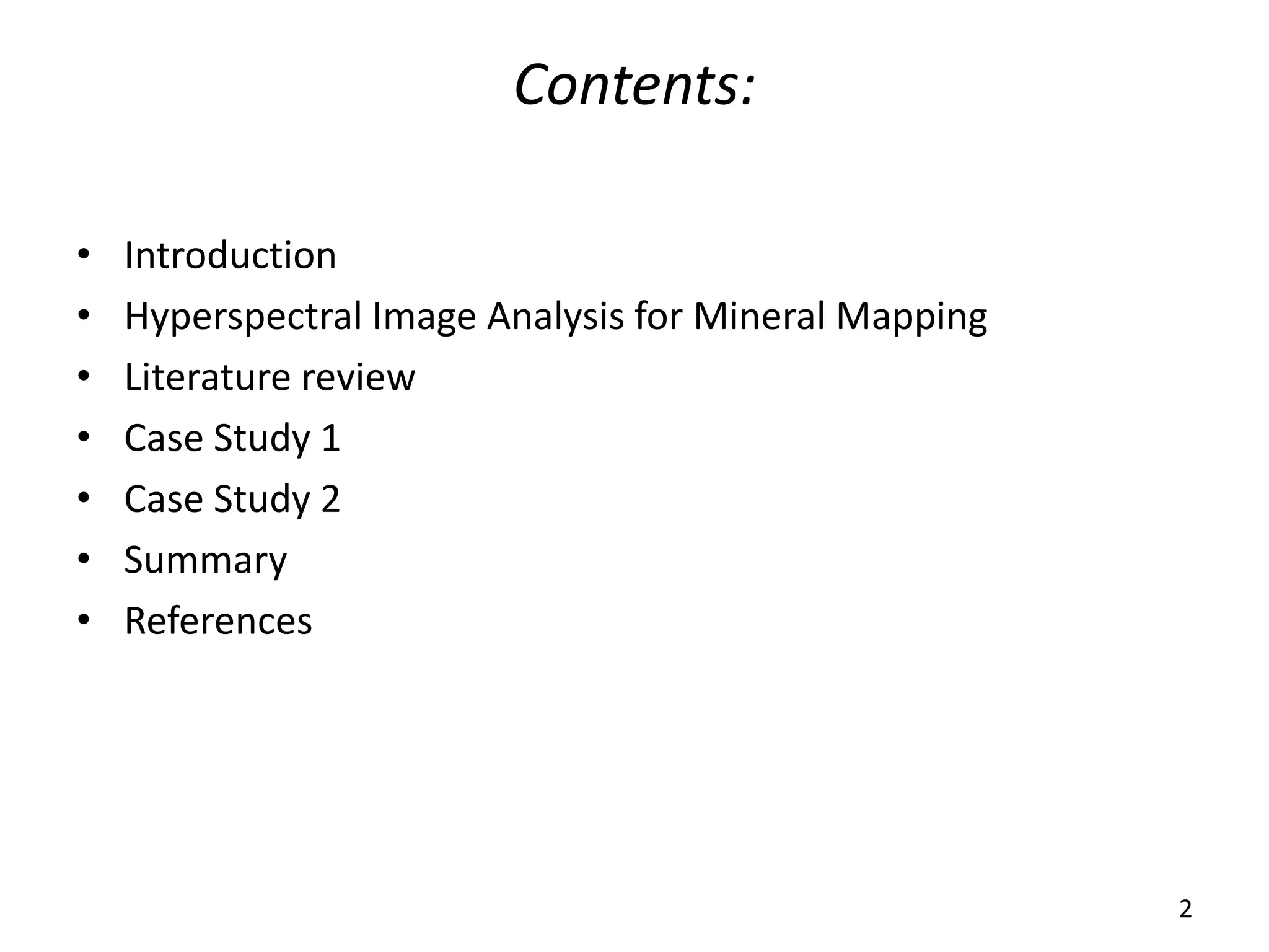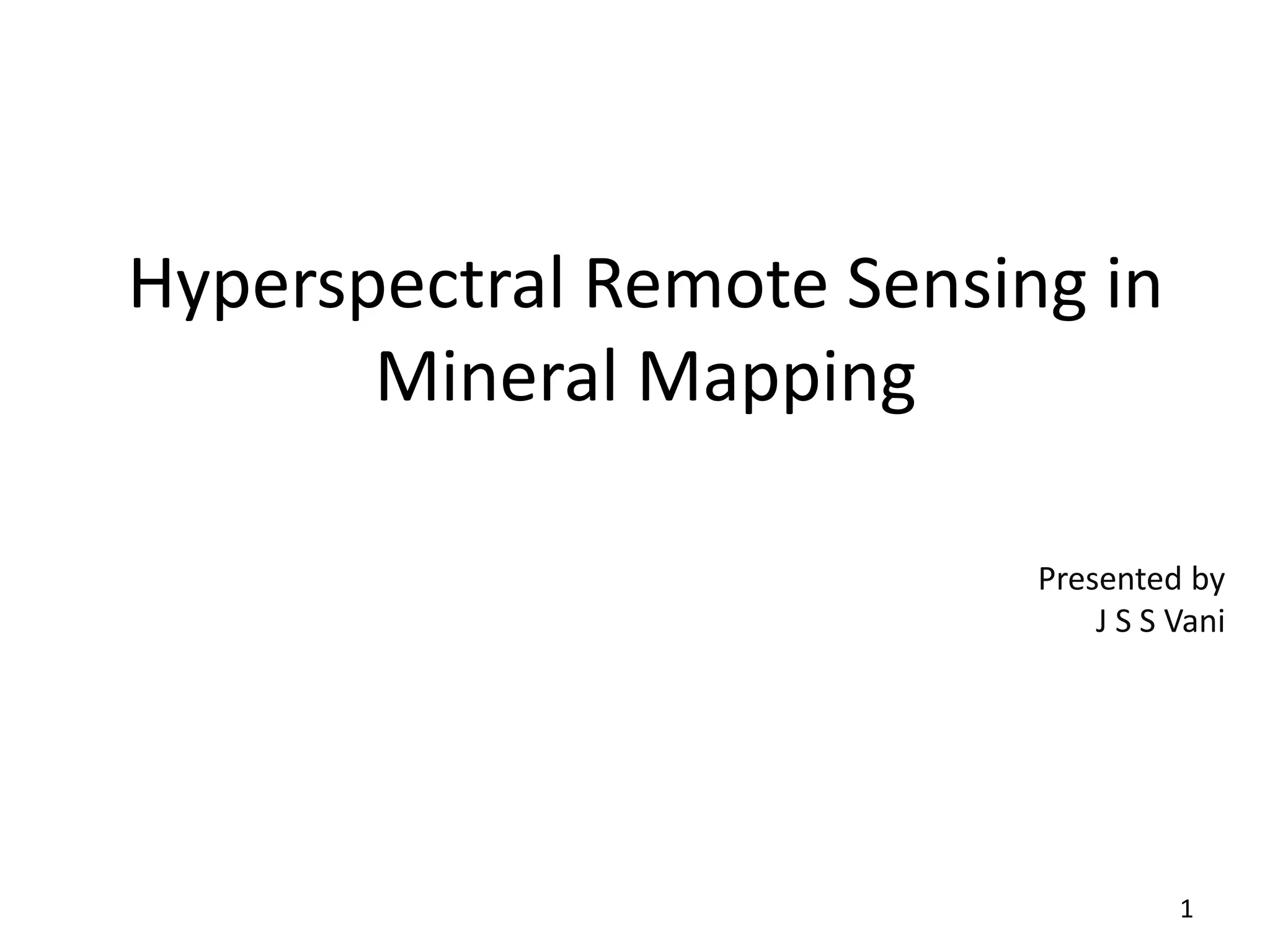 - The document discusses using hyperspectral remote sensing for mineral mapping. It provides background on how minerals have unique spectral signatures and defines hyperspectral imagery as image cubes with spatial and spectral data.