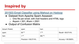 (1) The document describes building an email classifier using Spark MLlib. It loads spam and ham email datasets, trains a logistic regression model on tokenized and hashed features, and evaluates the model on test data.