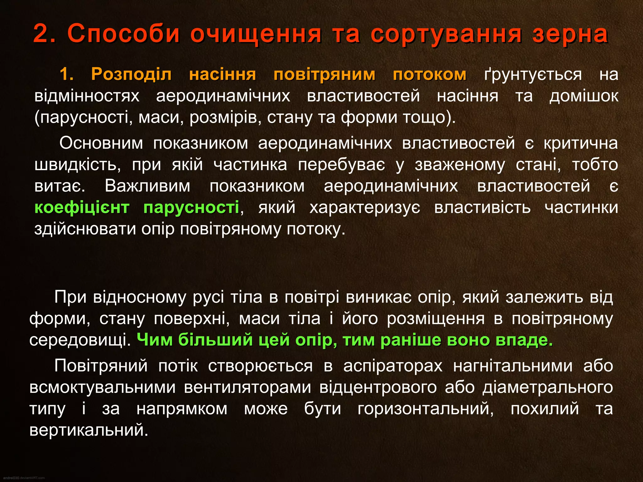 1. Розподіл насінняповітряним потоком1. Розподіл насіння повітряним потоком ґрунтується на