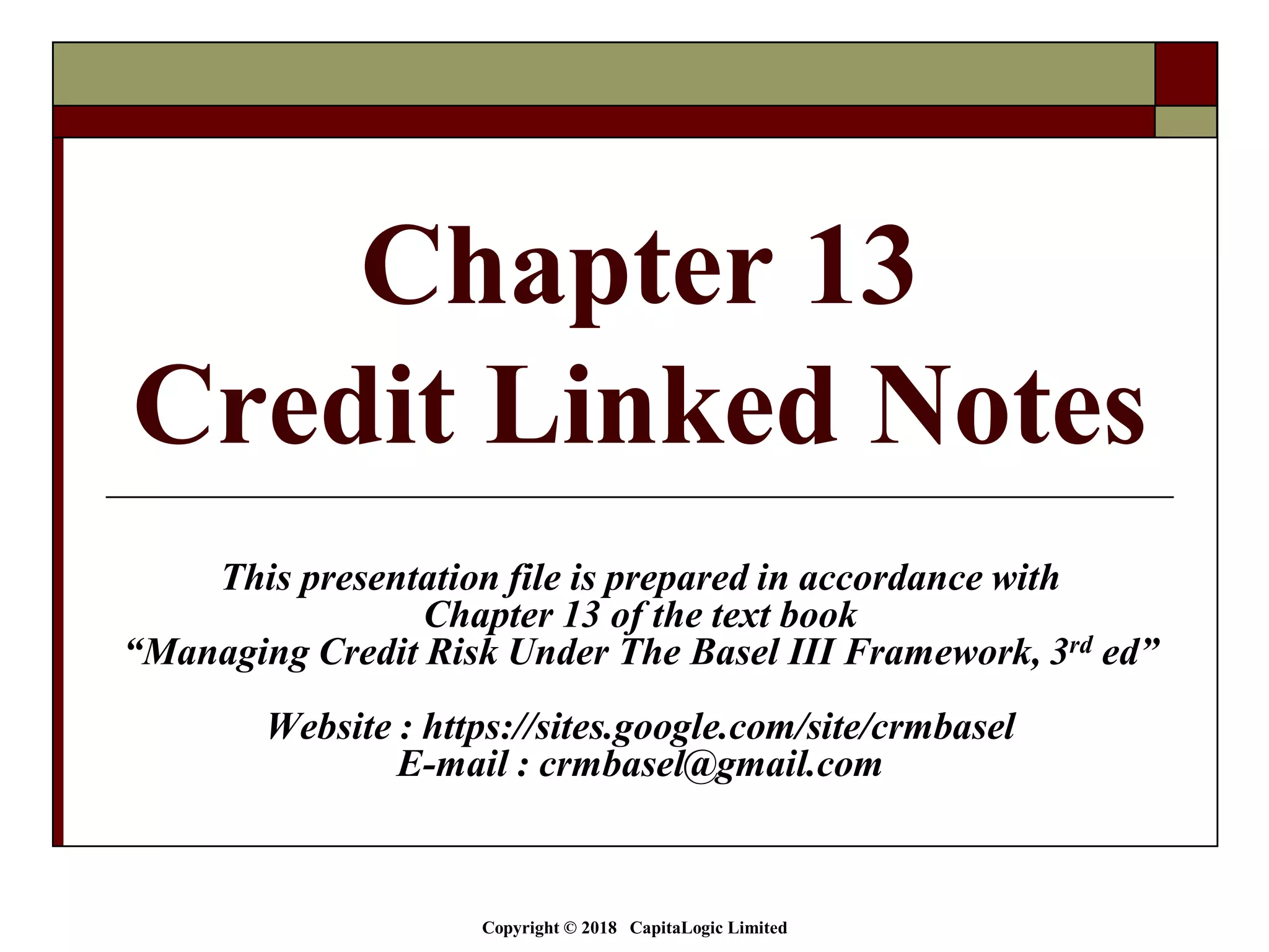 This document discusses different types of credit linked notes (CLNs), including single name CLNs, basket CLNs, and market value CLNs. It describes how each type works, including how they are structured using special purpose entities to isolate credit risk. Key details covered include how the cash flows of each CLN type are linked to underlying debts, how they are priced and valued, and how their credit risks are assessed.