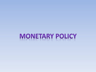 The document discusses monetary policy and fiscal policy as the main instruments that governments use to influence economic activity and stability. It describes the objectives, instruments, and effects of various monetary policy tools like bank rate, open market operations, cash reserve ratio, and statutory liquidity ratio. The document also outlines the objectives, components, and impacts of fiscal policy measures involving public expenditure, taxation, and public debt.