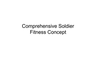 The document discusses the Comprehensive Soldier Fitness construct, which aims to improve the health and well-being of soldiers across four pillars: nutrition, physical conditioning, mental health/resilience, and moral/ethical development. It does this through initiatives like nutrition education, physical training programs integrated across the force generation cycle, and mental health support from pre-deployment to post-deployment reintegration. The goal is to enhance soldiers' fighting power by developing their intellect, emotions, motivation, and leadership.