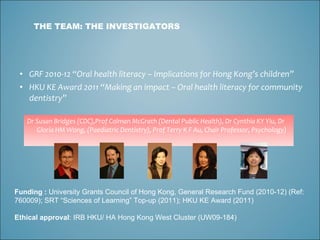 This document discusses a study examining oral health literacy and its implications for children in Hong Kong. The study had three objectives: 1) develop a new conceptual framework for oral health literacy, 2) create new tools to assess oral health literacy in Hong Kong, and 3) describe the relationship between oral health literacy and oral health status/management of preschool children. Researchers developed Chinese versions of assessment tools and collected data from 300 parent-child pairs. The study was funded by the University Grants Council of Hong Kong and involved investigators from dentistry, psychology, and other disciplines working collaboratively.
