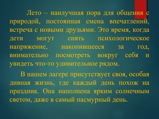 Документ представляет отчет о летнем пришкольном лагере 'Звёздочка', включающий описание этапов работы лагеря, такие как подготовительный, организационный, основной и заключительный. В ходе мероприятий акцент делается на развитие детских навыков, социальных и творческих способностей через различные игры, мастер-классы и соревнования. Итоговая часть подводит результаты работы лагеря, отмечая позитивные изменения в физическом и психологическом состоянии детей.
