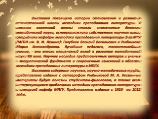 Выставка, посвященная 135-летию Василия Васильевича Голубкова и 130-летию Марии Александровны Рыбниковой, представляет издания из библиотеки филологического факультета МПГУ, отражающие историю методики преподавания литературы в России. Эти выдающиеся педагоги внесли значительный вклад в методическую науку XX века, создав теоретический фундамент для современных исследований в данной области. Материалы выставки будут полезны студентам-филологам и всем интересующимся методикой преподавания литературы.