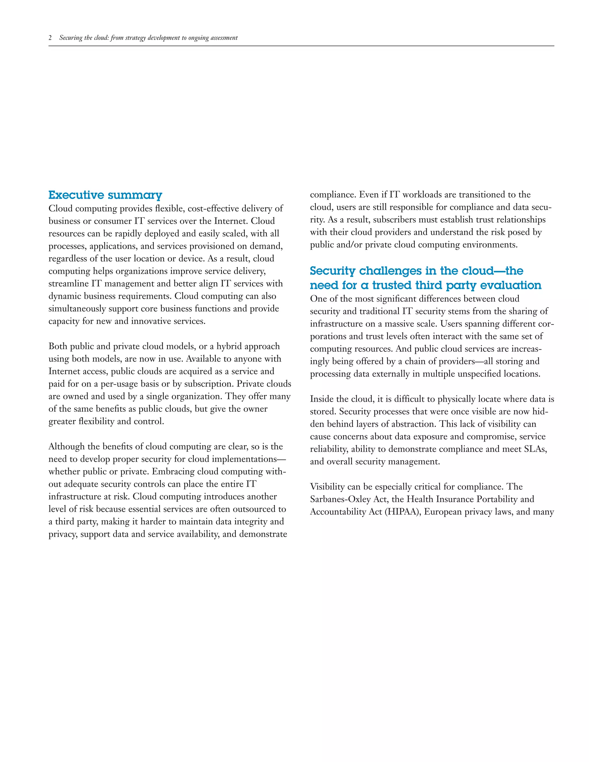 IBM provides strategies for assessing cloud security risks. Key steps include developing a strategic cloud security roadmap, identifying risks specific to public and private cloud models, and conducting assessments of cloud security architectures. IBM security experts evaluate cloud security programs against best practices and provide recommendations to address gaps through additional controls, policies, identity management, or managed security services. Regular technical testing also helps evaluate security weaknesses impacting data protection.