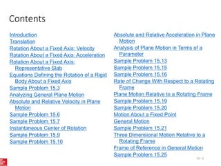 The document discusses kinematics of rigid bodies, including different types of motion such as translation, rotation about a fixed axis, and general plane motion. It provides equations to define velocity and acceleration for different types of rigid body motion. Sample problems are included to demonstrate how to analyze and calculate velocities, accelerations, angular velocities, and angular accelerations of points on rigid bodies undergoing various motions. Key concepts covered include absolute and relative velocity and acceleration in plane motion, and analyzing general plane motion as a combination of translation and rotation.
