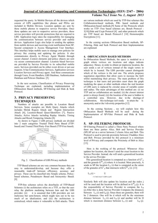 This document summarizes a research paper on privacy in location-based services. It discusses how location privacy is an important issue for location-based services. It describes an architecture used to implement privacy-preserving location services with a client-server model. It also discusses various techniques used for preserving privacy, including obfuscation-based methods, SP-filtering protocols, and Hide and Seek protocols. The paper focuses on implementing and combining the SP-filtering and Hide and Seek protocols to determine if two users are in proximity while preserving their location privacy. It provides details on how these protocols work and how they are implemented using obfuscated locations.