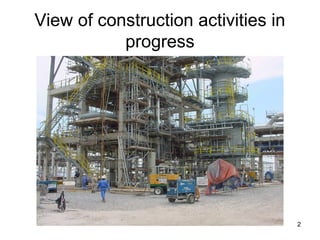 The document discusses construction safety, outlining various hazards and accidents that can occur at construction sites. It defines construction activities according to relevant legislation and lists common machinery, tools, and hazards. Accidents like falls, collapses, and electric shock are described along with their causes. The summary emphasizes the variety of potential hazards on construction sites and the need for employers to properly manage safety and health to protect employees and comply with legislative requirements.