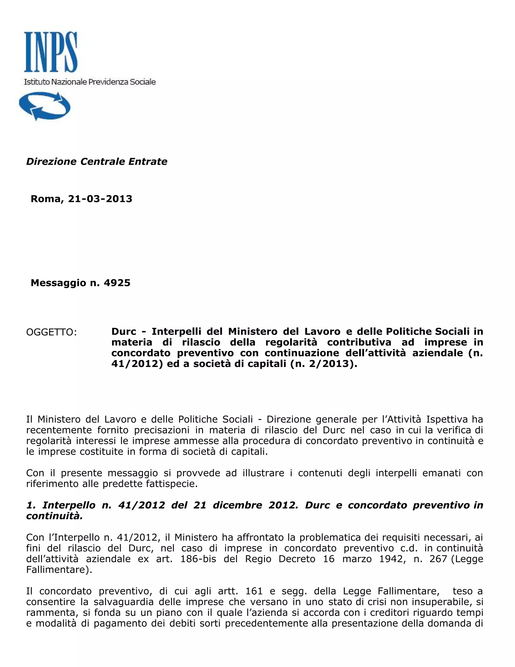 Il messaggio n. 4925 del 21 marzo 2013 del Ministero del Lavoro fornisce chiarimenti sulla concessione del DURC per le imprese in concordato preventivo e le società di capitali. Viene delineata la possibilità di ottenere la regolarità contributiva per le imprese in concordato, a condizione che soddisfino requisiti specifici definiti dal piano di risanamento. Inoltre, si specifica che per le società di capitali, la verifica della regolarità contributiva è limitata agli obblighi del datore di lavoro, senza considerare le irregolarità dei singoli soci.
