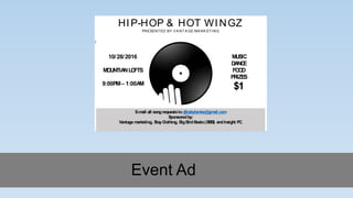 An event ad promotes a hip-hop and hot wing event on October 28, 2016 from 9:00pm to 1:00am at MountainLofts. The event will feature music, dancing, food, and prizes. Attendees can email song requests to djbabybenke@gmail.com. The event is sponsored by Vantage Marketing, Stay Clothing, BigBirdBeats, and Insight PC.